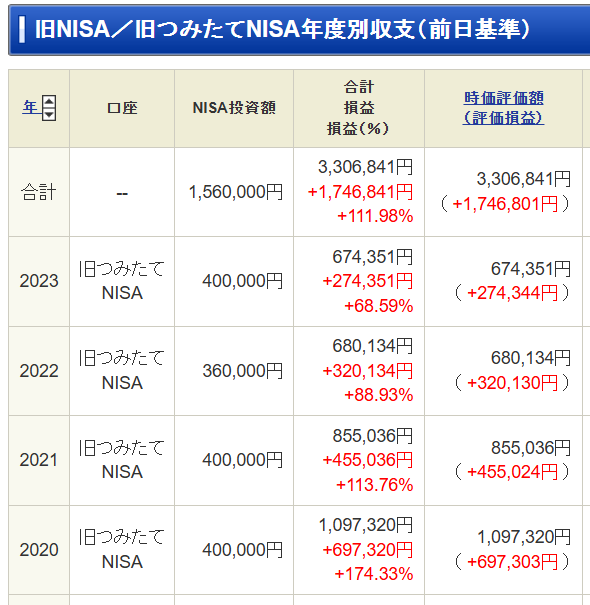 旧NISA | ¥3,306,841 | ¥1,746,841 | ¥1,560,000 | +112.0% |